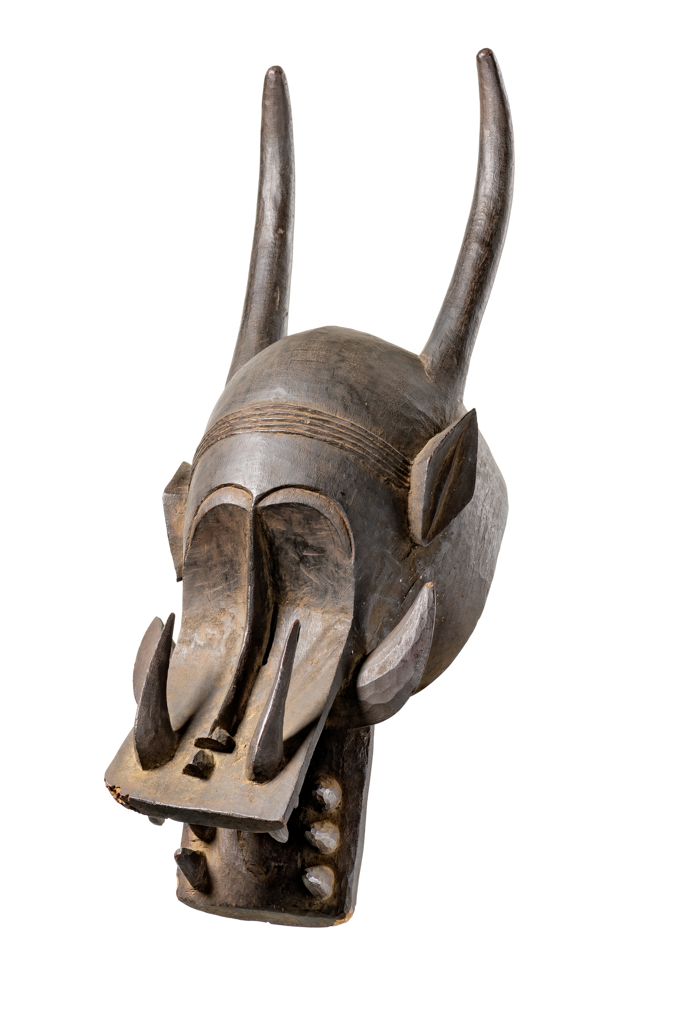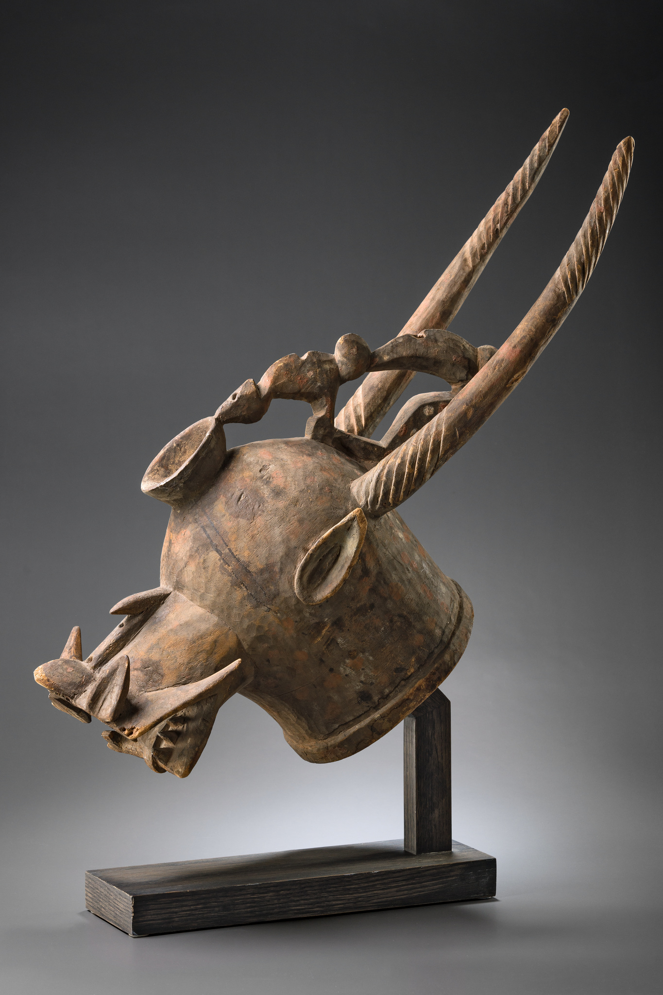 Dit helmmasker is een begrafenismasker van het geheime Poro-genootschap. Het wordt ook wel ‘vuurspuwer’ genoemd en heeft in zijn uiterlijk elementen van verschillende dieren: horens van een antilope en een ram, de bek van een hyena, de tanden van een krokodil. Het masker werd gebruikt zowel ter verering van de doden als ter bestrijding en vernietiging van de zwarte magie en kwaadwillende geesten. In het potje dat de kameleon vasthoudt werden kruiden bewaard waaraan het masker zijn kracht en agressieve voorkomen ontleende.